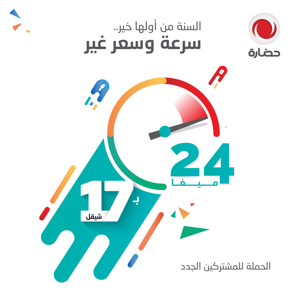 رام الله - الاقتصادي - أعلنت شركة حضارة للإستثمار التكنولوجي إحدى شركات مجموعة الاتصالات الفلسطينية عن إطلاقها حملة جديدة بحلول عام 2018 تحت شعار "السنة من اولها خير...سرعة وسعر غير" وقد شملت هذه الحملة مشتركين حضارة الجدد في الضفة الغربية وقطاع غزة .