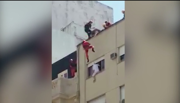 ولدى وصول المنقذين إلى موقع الحادث، شوهد رجل في العقد الثالث من عمره وهو يتكئ على نافذة في محاولة منه للقفز إلى الأسفل، الأمر الذي دفع رجال الإطفاء إلى بدء عملية سريعة لإنقاذه، وأظهر مقطع الفيديو الذي صوره أحد الجيران، رجلي إطفاء يتدليان من سطح المبنى ويركلان الرجل إلى داخل شقته بحركة سريعة وخاطفة، وفق ما نقلت صحيفة ديلي ميل البريطانية.