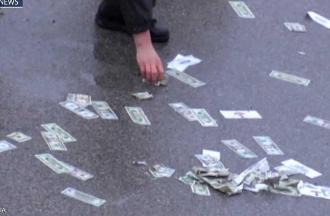 ويظهر شريط فيديو عناصر الشرطة وهم يجمعون الدولارات المتناثرة، التي كانت معظمها مبللة بفعل الأمطار.