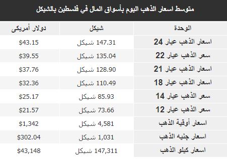 رام الله - الاقتصادي - جاءت اسعار غرام الذهب اليوم الأربعاء في فلسطين لعيارات 18.21.22.24 على النحو التالي : -
