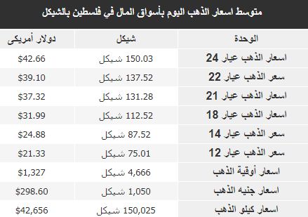 رام الله - الاقتصادي - جاءت اسعار الذهب اليوم الثلاثاء في فلسطين لعيارات 18.21.22.24 على النحو التالي : -