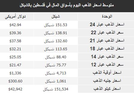 رام الله - الاقتصادي - جاءت اسعار الذهب اليوم الأربعاء في فلسطين لعيارات 18.21.22.24 على النحو التالي : -