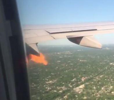 شاهد اشتعال النيران في محرك طائرة وهبوطها اضطراريا
