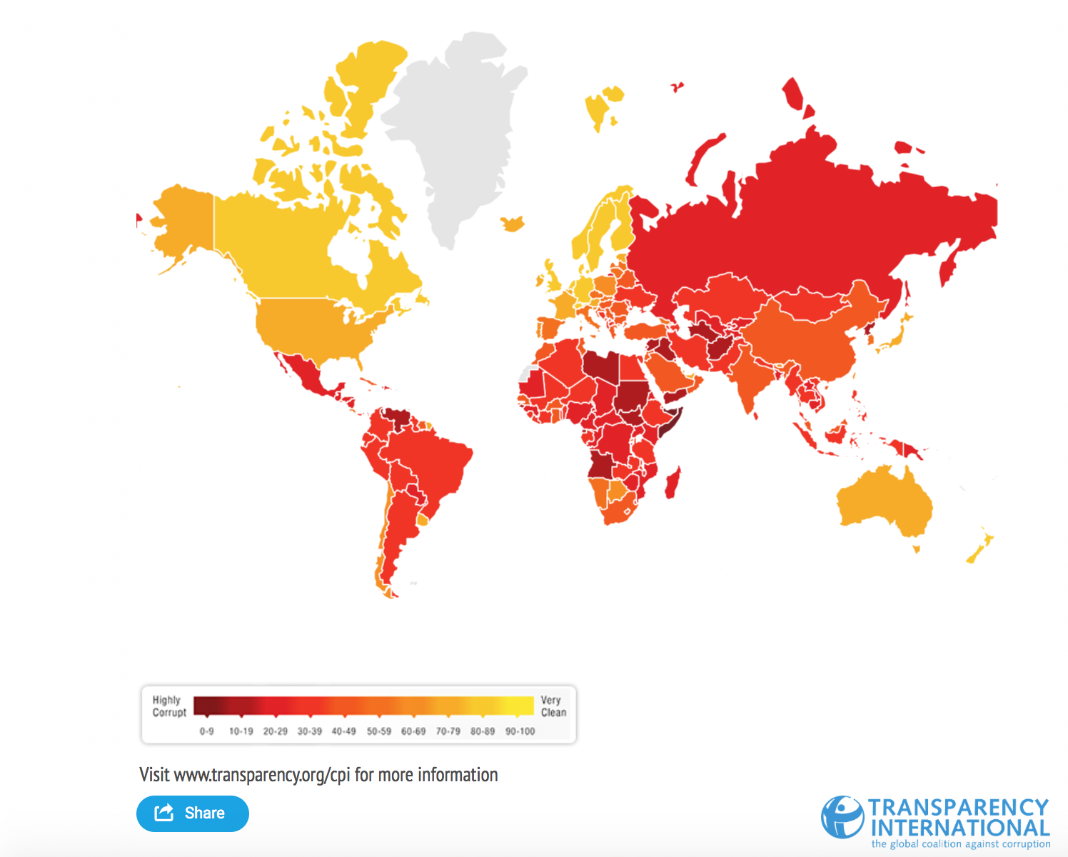 وأشار التقرير إلى أن أكثر من ثلثي الدول المنضمة فيه كانت فيها نسب فساد مرتفعة، إذ حصلت أكثر من ثلثي الدول على ترتيب دون 50 نقطة.