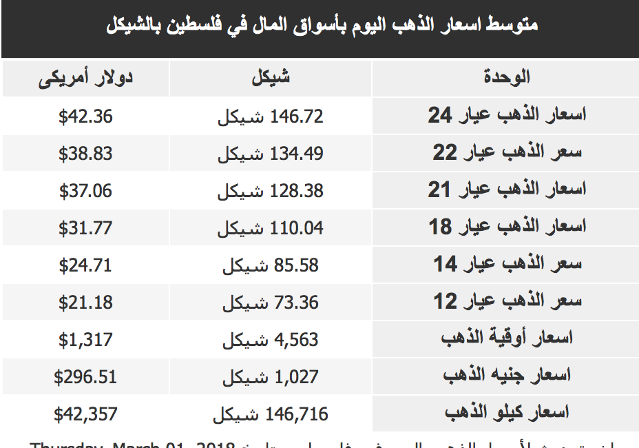 رام الله - الاقتصادي - جاءت أسعار الذهب المباعة في السوق الفلسطينية للمستهلكلين، وفق أسعار اليوم الجمعة، على النحو التالي: