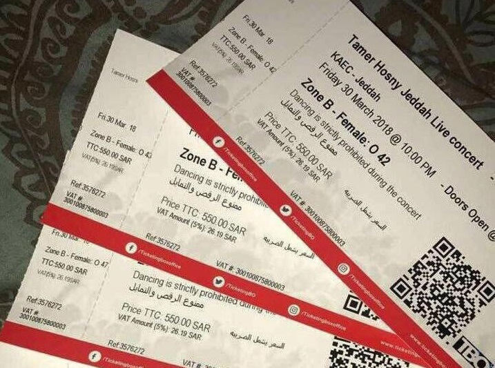 وتنقسم تذاكر الحفل لأكثر من فئة بداية من 300 ريال مرورا بـ500، و800، و1000، و1200، وصولا إلى فئة 1500 ريال (الدولار يساوي 3.75 ريال سعودي).