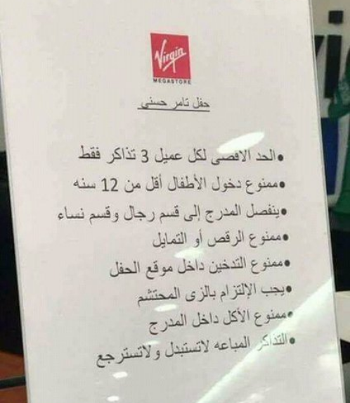 وانتشرت صورة لشروط الحفل والتي كان أبرزها، عدم الرقص والتمايل والالتزام بالملابس المحتشمة ومنع دخول الأطفال أقل من 12 عاما.