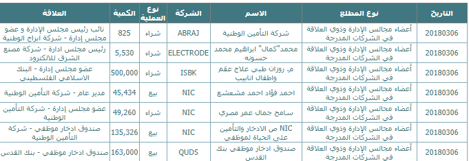 رام الله - خاص الاقتصادي - بينت معطيات رسمية صادرة عن بورصة فلسطين، اليوم الأربعاء، أن 7 صفقات تداول (بيع وشراء)، تمت من جانب أفراد أو مؤسسات مطلعة على أداء الشركات، أو ذات علاقة بها.