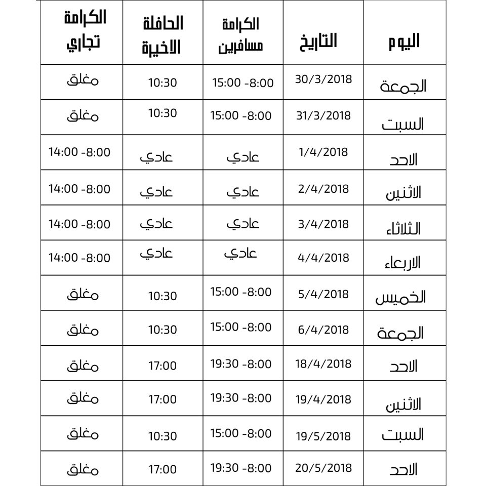 واليكم جدول التعديلات بالكامل على دوام عمل معبر الكرامة:-