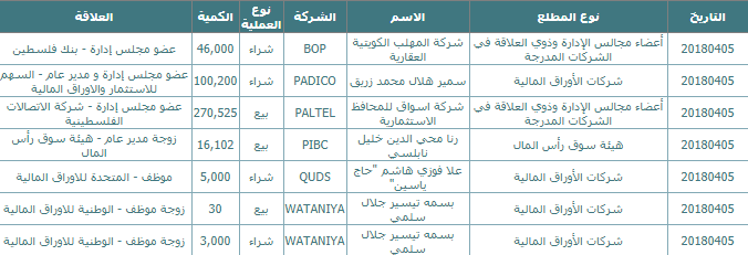 رام الله - خاص الاقتصادي - بينت معطيات رسمية صادرة عن بورصة فلسطين، اليوم الخميس أن 7 صفقات تداول (بيع وشراء)، تمت من جانب أفراد أو مؤسسات مطلعة على أداء الشركات، أو ذات علاقة بها.