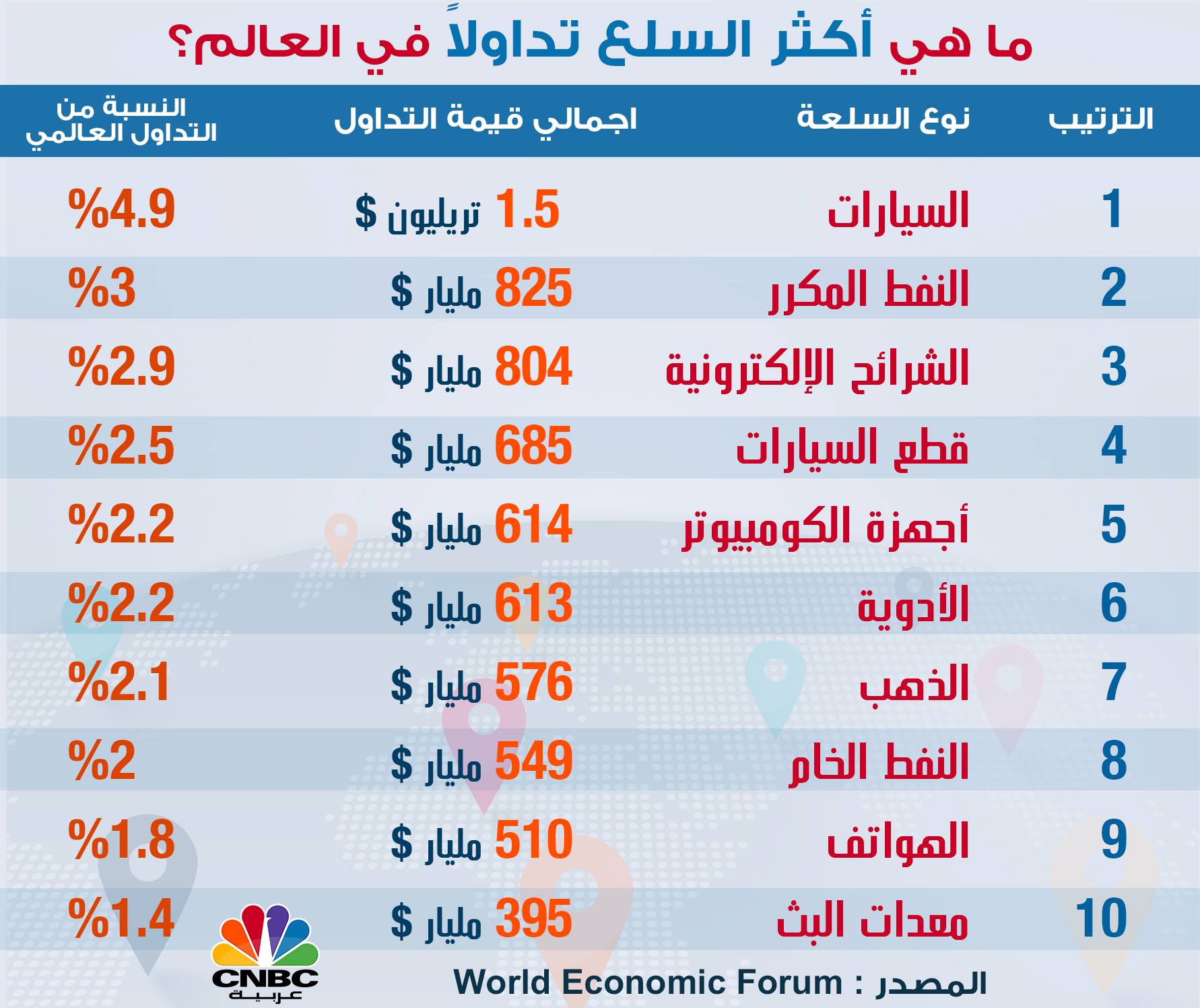 في الصورة التالية، يظهر ترتيب السلع حسب قيمة مبيعاتها السنوية ونسبتها من إجمالي التداول العالمي للسلع:
