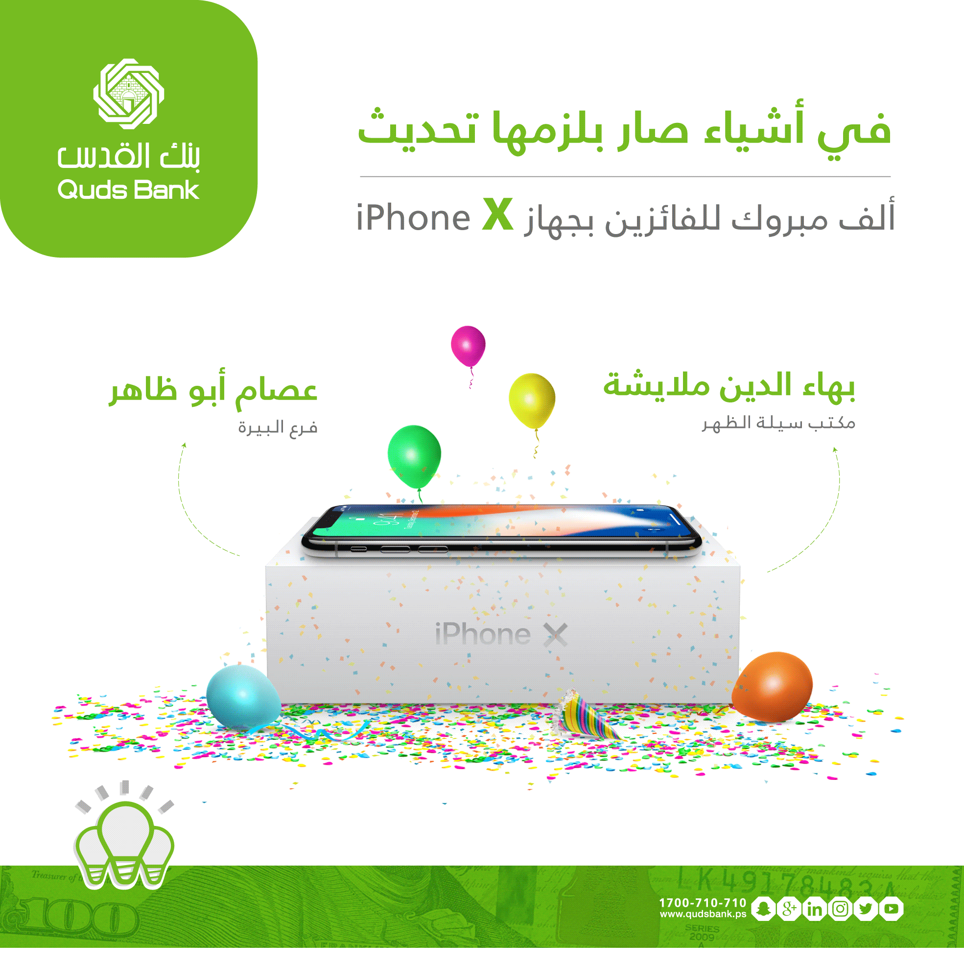 رام الله - الاقتصادي - سلم بنك القدس الجائزة الأخيرة لحملة تحديث البيانات " في أشياء صار بلزمها تحدبث" عن شهر أذار والمتمثلة بـ جهاز IPhoneX حيث ربحها كل من السيد بهاء الدين ملايشة مكتب – سيلة الظهر، والسيد عصام أبو ظاهر فرع – البيرة.