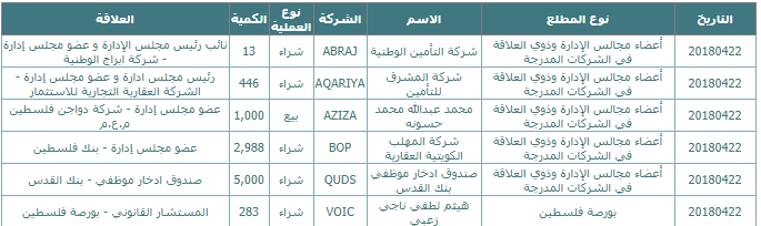 خاص الاقتصادي - بينت معطيات رسمية صادرة عن بورصة فلسطين، اليوم الاحد ان6 صفقات تداول (بيع وشراء)، تمت من جانب أفراد أو مؤسسات مطلعة على أداء الشركات، أو ذات علاقة بها.