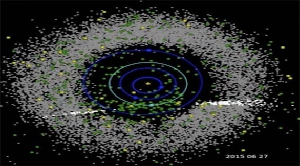 وتظهر الصور كوكب الأرض ممثلاً بنقطة زرقاء تحيط بها المئات من النقاط الخضراء التي تمثل الكويكبات والمذنبات التي تمر بالقرب من الأرض، وتعرف باسم (NEOs)