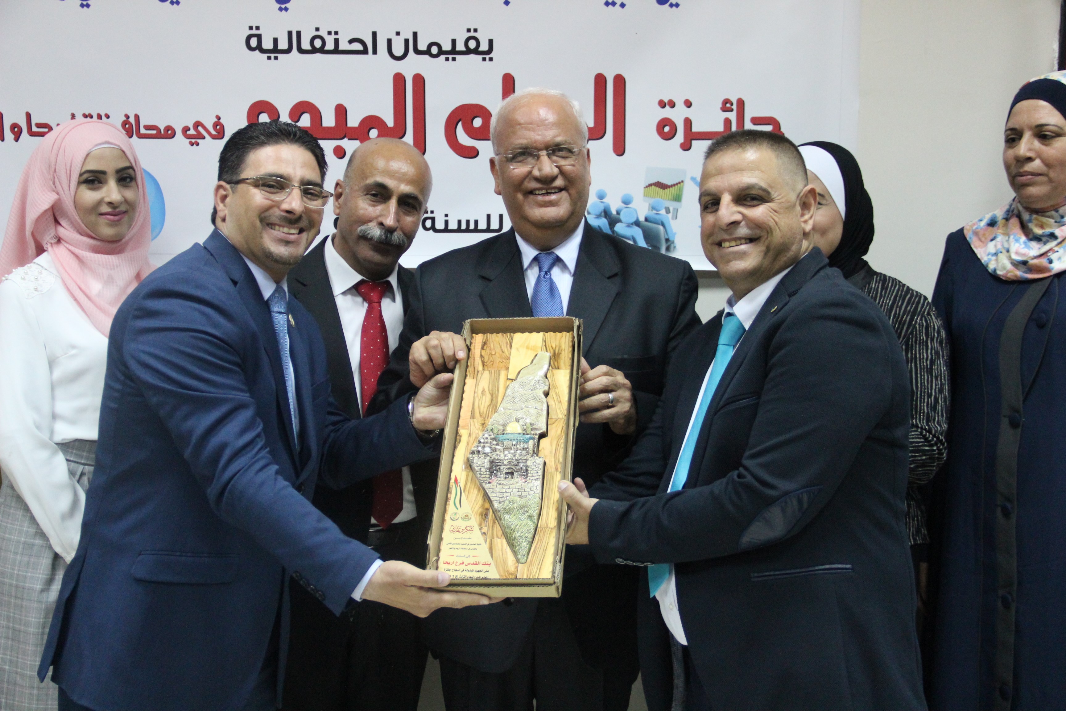في نهاية الحفل قام د. صائب عريقات والمنظمون بتكريم بنك القدس وتسليم الجوائز وشهادات التميز للفائزين ودروع للمساهمين والداعمين لهذه الجائزة.