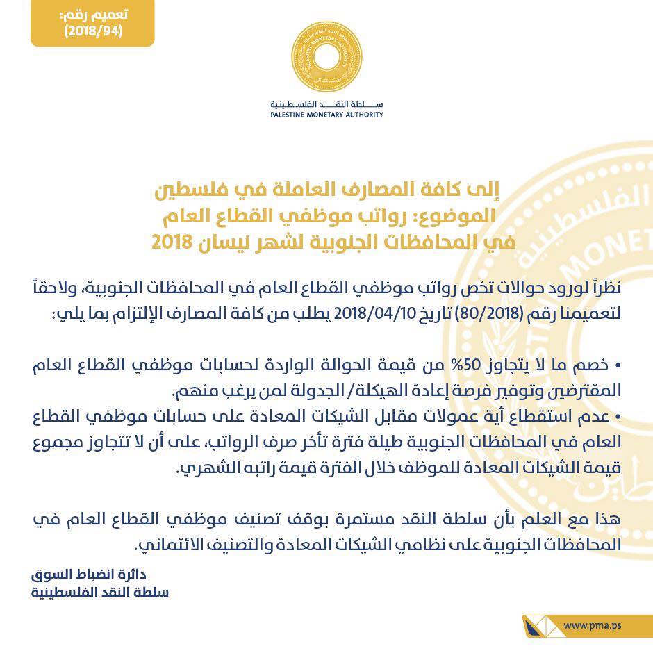 رام الله - الاقتصادي - اصدرت سلطة النقد الفلسطينية، اليوم ، بياناً الى البنوك والمصارف العاملة في قطاع غزة حول اقتطاعات القروض والشيكات المعادة على موظفي القطاع العام بسبب عدم صرف راتب الشهر الماضي.