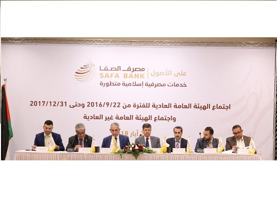 رام الله - الاقتصادي - عقد مصرف الصفا "الإسلامي" اجتماع الهيئة العامة العادي وغير العادي يوم الإثنين 28/5/2018 في فندق الكرمل بمدينة رام الله، وترأس الجلسة معالي السيد "محمد كمال" حسونة نائب رئيس مجلس ادارة المصرف، وبحضور كل من السيد نضال البرغوثي المدير العام لمصرف الصفا، والدكتور حاتم سرحان مراقب الشركات في وزارة الاقتصاد الوطني ، والسيد مشهور أبو جيش ممثلاً عن سلطة النقد الفلسطينية، والسيد سائد عبد الله ممثلاً عن شركة آرنست ويونغ المدقق الخارجي للحسابات، والسيد مراد جدبة ممثلاً عن هيئة سوق رأس المال الفلسطينية ، والدكتور أيمن البدارين العضو التنفيذي لهيئة الرقابة الشرعية ، والمساهمين.