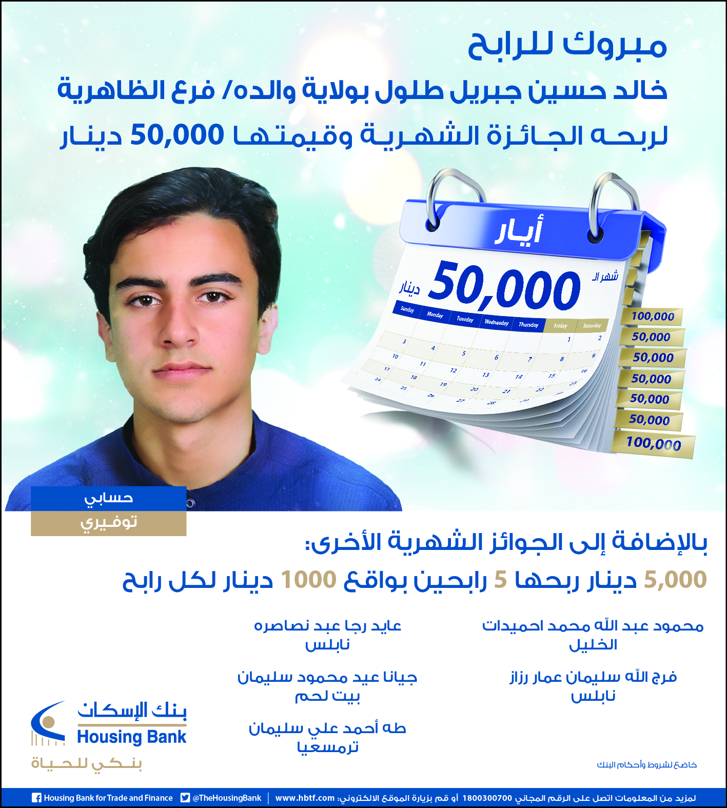 ويذكر بهذه المناسبة بـأن مجموع الجـوائز النقـدية التي يقدمها بنك الاسـكـان فروع فلسطين لحسابات التوفير للعام 2018 تزيـد عـن 760,000 دينار سنوياً، علما بأن الحملة تمنح العملاء من المدّخرين فرص الربح بجائزة كبرى بقيمة 100 ألف دينار لرابح واحد مرتين سنوياً في كل من شهر حزيران 2018 وكانون أول 2018، بالإضافة الى جائزة شهرية بقيمة 50 ألف دينار ًولرابح واحد شهريا وجوائز شهرية لـ 5 رابحين بواقع 1000 دينار لكل رابح.