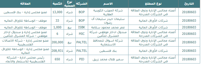 رام الله - خاص الاقتصادي - بينت معطيات رسمية صادرة عن بورصة فلسطين، اليوم الاحد، ان7 صفقات تداول (بيع وشراء)، تمت من جانب أفراد أو مؤسسات مطلعة على أداء الشركات، أو ذات علاقة بها.