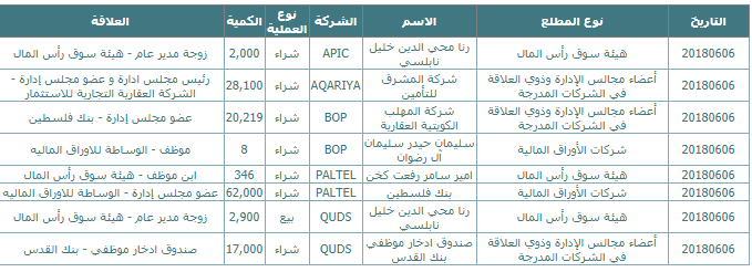 رام الله - خاص الاقتصادي - بينت معطيات رسمية صادرة عن بورصة فلسطين، اليوم الاربعاء، ان8 صفقات تداول (بيع وشراء)، تمت من جانب أفراد أو مؤسسات مطلعة على أداء الشركات، أو ذات علاقة بها.