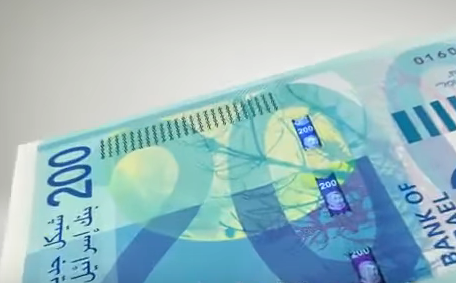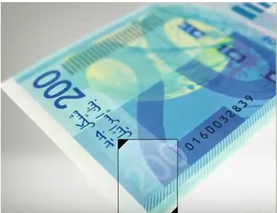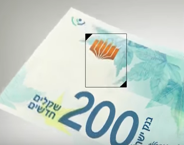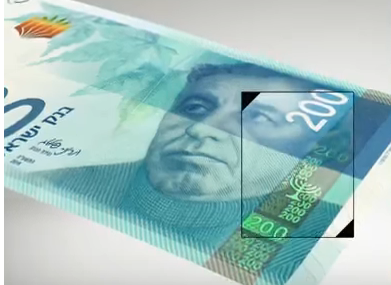 وأشار إلى وجود خط لامع في عرض الورقة النقدية، حيث يجب أن يخفتي ويظهر "الشمعدان الاسرائيلي وقيمة العملة"، على الخط اللامع عند إمالة الورقة، إضافة الى الكتاب الذهبي الموجود على الورقة، والذي يجب أن يتغير لونه من الذهبي إلى الاخضر عند إمالة الورقة النقدية.