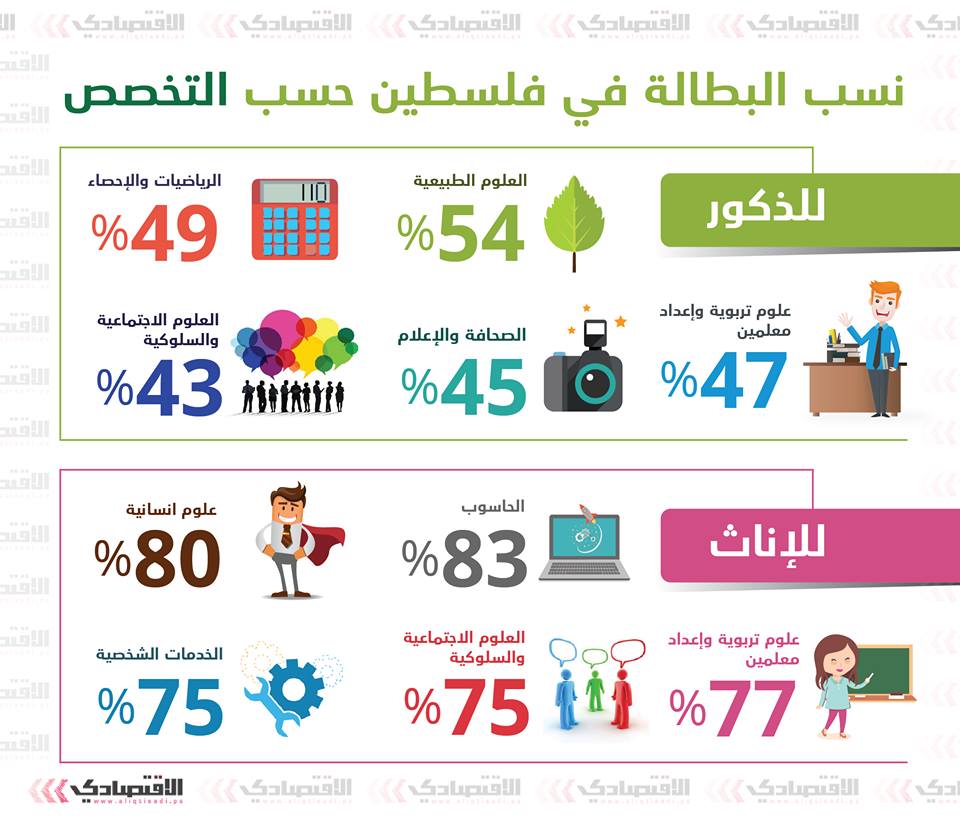 وبلغت نسبة بطالة خريجي الجامعات بواقع 41% في الضفة الغربية و73% في قطاع غزة.