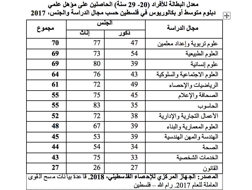 وأظهر تقرير الإحصاء الفلسطيني، ارتفاع معدل البطالة بين الأفراد 20-29 سنة في 2017 الحاصلين على مؤهل دبلوم متوسط أو بكالوريوس في فلسطين إلى 56%.