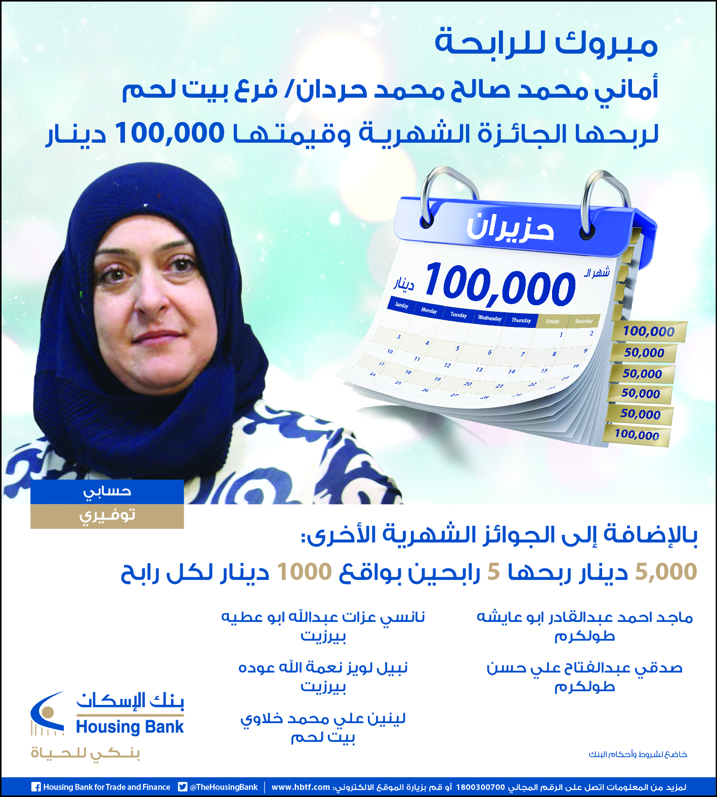 رام الله - الاقتصادي - أعلن بنك الإسكان فروع فلسطين عن نتائج السحب على " الجائزة الشهرية " لجوائز حسابات التوفير لشهر حزيران 2018 الحالي والتي تبلغ قيمتها 100,000ألف دينار حيث ربحتها " أماني محمد صالح محمد حردان" وهو صاحبة حساب توفير لدى بنك الإسكان فروع فلسطين / فرع بيت لحم، بالإضافة الى 5 رابحين بجوائز شهرية قيمة كل منها 1,000 دينار.