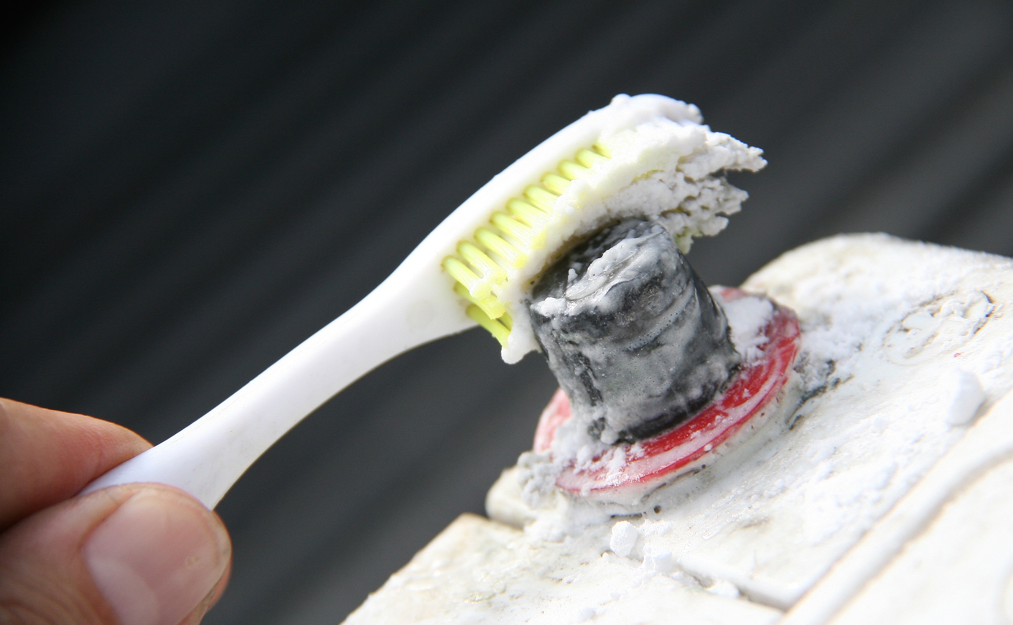 • إذا كانت الرواسب الموجودة على قطبي البطارية صلبة، يمكنك استخدام فرشاة أسنان قديمة، أو فرشاة تنظيف ذات شعيرات بلاستيكية.