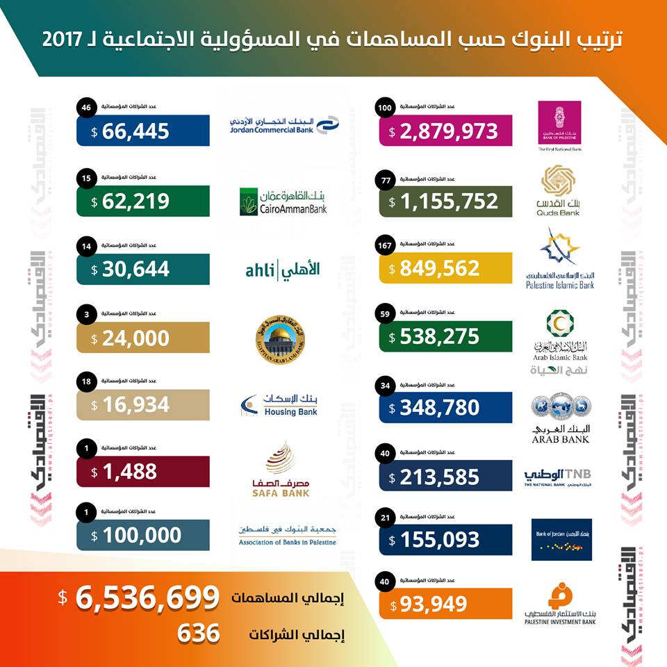 رام الله - متابعة الاقتصادي - كشف تقرير رسمي حديث، أن البنوك العاملة في السوق الفلسطينية، قدمت مساهمات اجتماعية لمشاريع وفعاليات بقيمة 6.5 ملايين دولار في 2017.