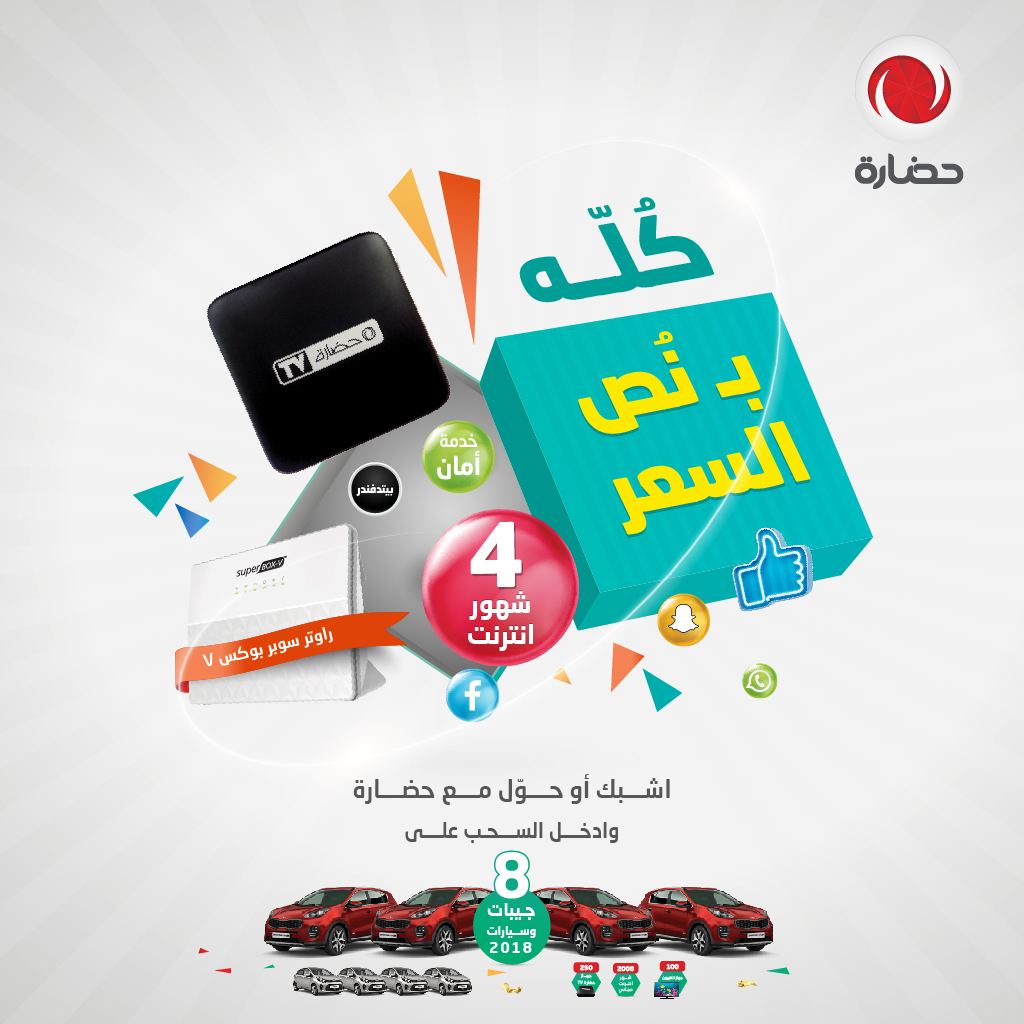 يذكر أن حضارة تمنح المشتركين الجدد من خلال حملة « كله بنص السعر» العديد من المزايا والخصومات التي تشمل خصم 50% على الأقل على خدماتها ومنتجاتها وبشكل حصري لدى الشركة، ويشمل الخصم (سعر اشتراك الانترنت ضمن سرعات الأنترنت على حزم برايم ،وخصم على راوتر السوبر بوكسv وخدمات حضارة المضافة " أمان و بيتدفندر".