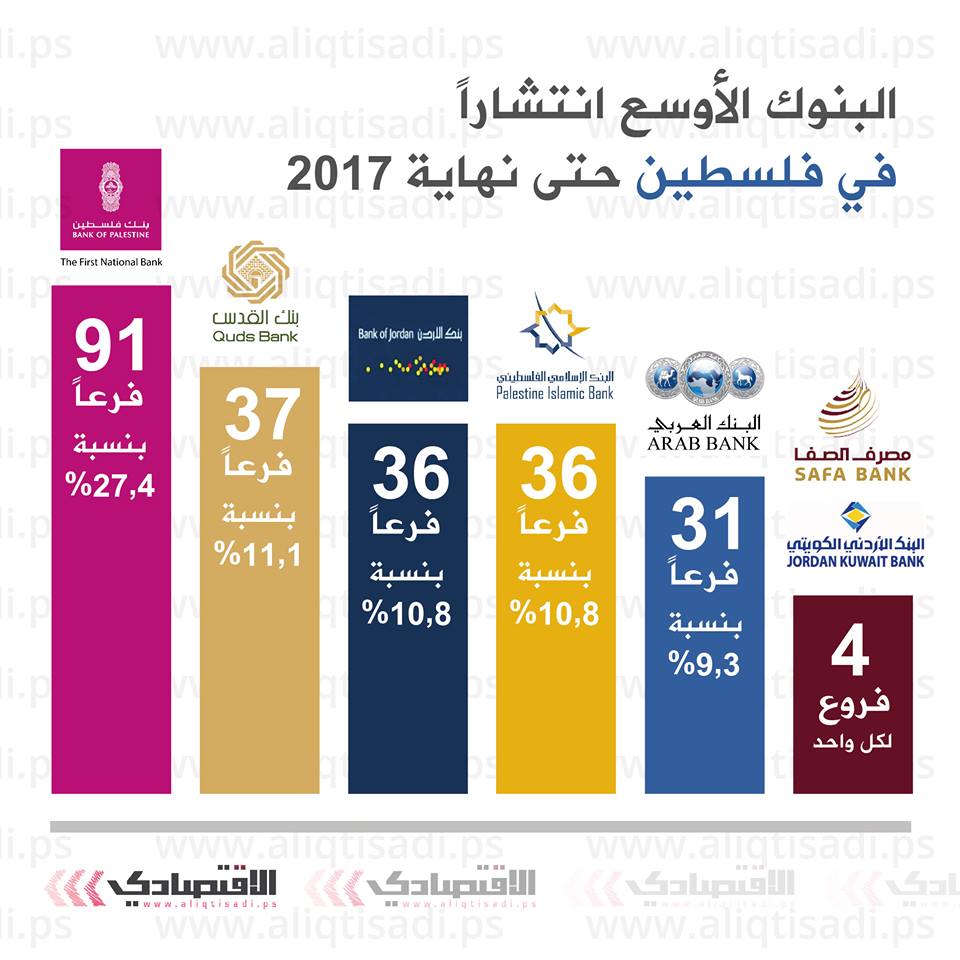 وتصدر بنك فلسطين، المصارف الأوسع انتشارا في السوق المحلية، إذ يملك حتى نهاية 2017 نحو 91 فرعا، تشكل نسبتها 27.4% من فروع القطاع المصرفي.