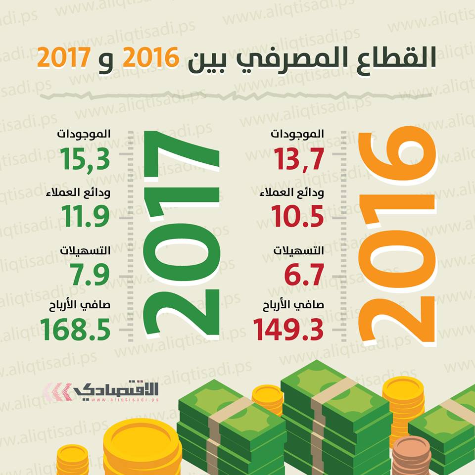 بلغ صافي أرباح القطاع المصرفي الفلسطيني، خلال العام الماضي نحو 168.5 مليون دولار أمريكي، مقارنة مع 149.3 مليون دولار في 2016.