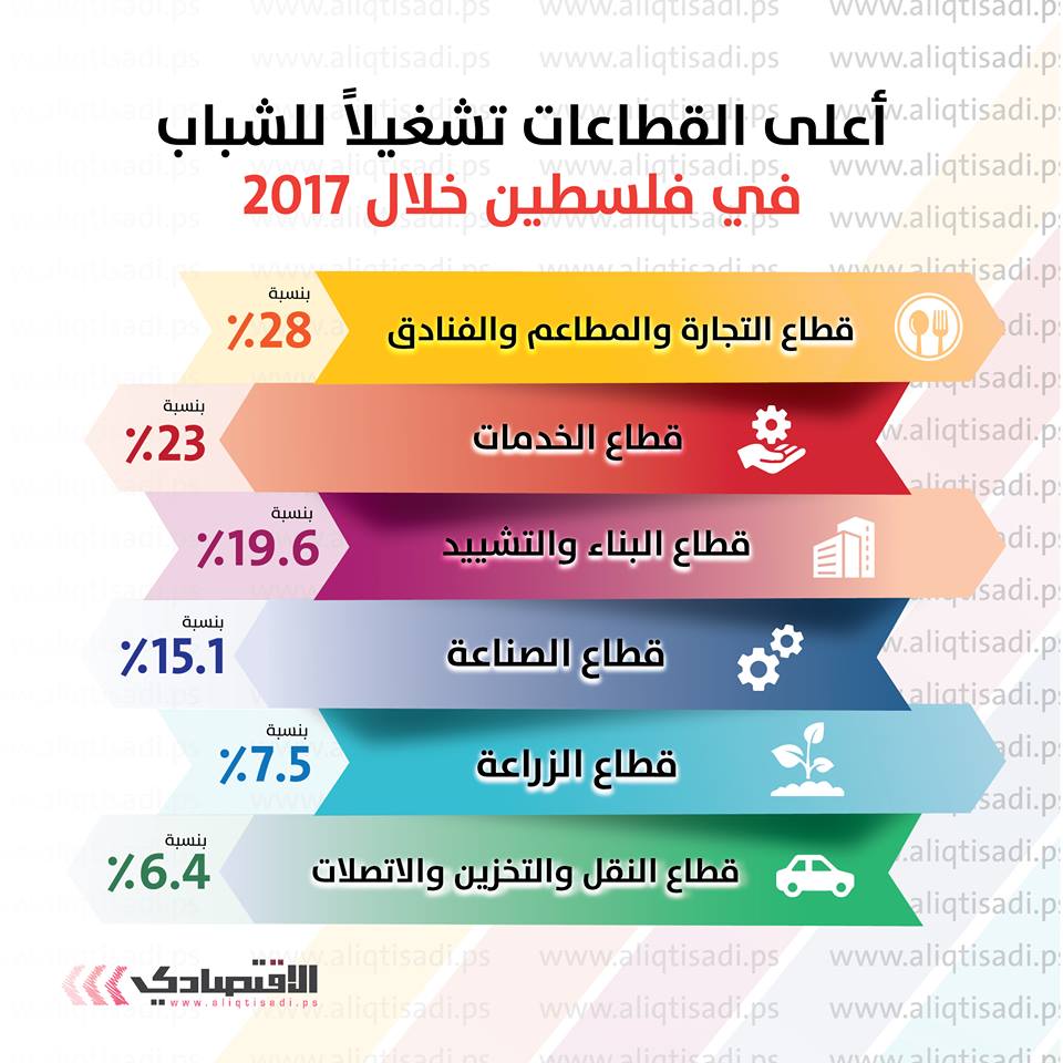 وفيما يتعلق بأكثر قطاعات العمل استيعاباً للشباب في فلسطين، جاء قطاع الخدمات في المركز الثاني خلف التجارة والمطاعم والفنادق، بنسبة 23%.