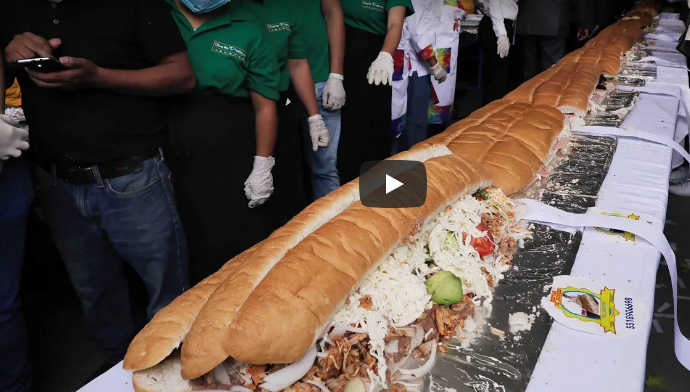 ونقلاً عن موقع "CGTN". شارك المئات في صنع الساندويتش العملاق الذي يعتبر أطول ساندويتش في العالم ليصل طوله إلى 70 متراً في مكسيكو سيتي في المكسيك.