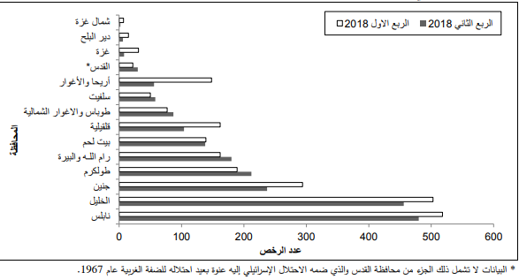وفي بيت لحم قدرت بـ 140 رخصة، قلقيلية 100 رخصة، وهذا الجدول يوضح عدد الرخص خلال الربع الاول والثاني من العام الجاري.