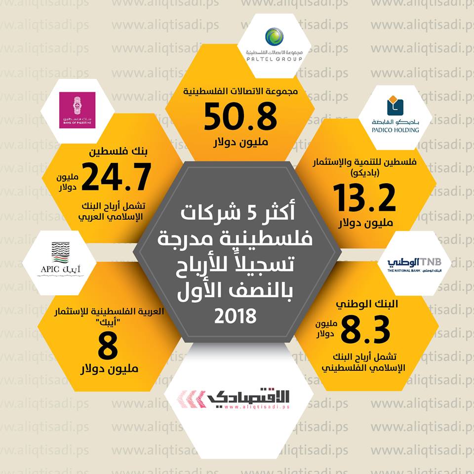 - بنك فلسطين: سجل بنك فلسطين صافي أرباح بعد الضريبة بقيمة 24.7 مليون دولار (تشمل أرباح البنك الإسلامي العربي)، وهي تقريبا ذات قيمة الربح في الفترة المقابلة من 2017.