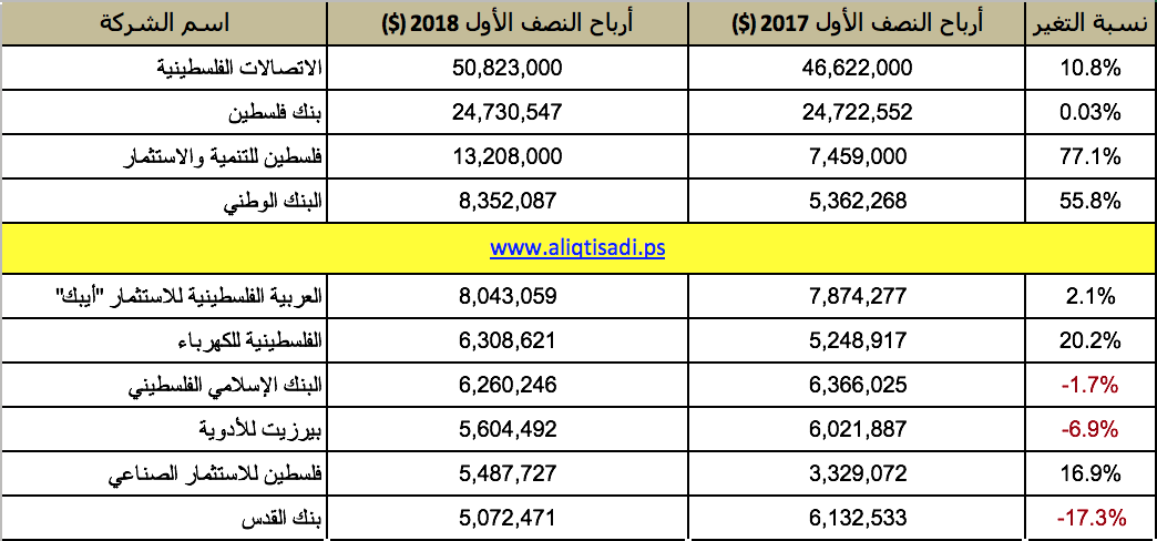 في الجدول التالي، ترتيب الشركات العشر المدرجة في بورصة فلسطين، الأكثر ربحا خلال النصف الأول 2018: