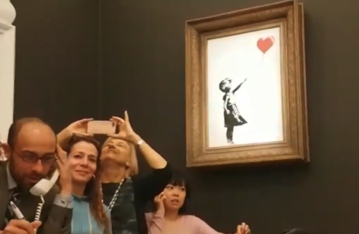 ونشر بانكسي صورة على تطبيق إنستجرام لجمهور مصدوم أثناء مشاهدة اللوحة وهي تتمزق إلى منتصفها تقريبا وكتب تعليقا يقول "ها هي تضيع، تضيع، ضاعت...".