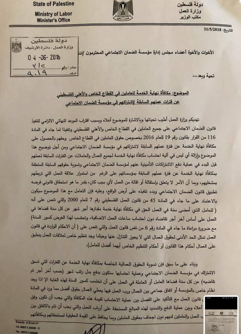 وتاليا الوثيقة الصادرة عن الوزير أبو شهلا بشأن صرف راتب شهر عن كل عام للموظفين في القطاع الخاص.: