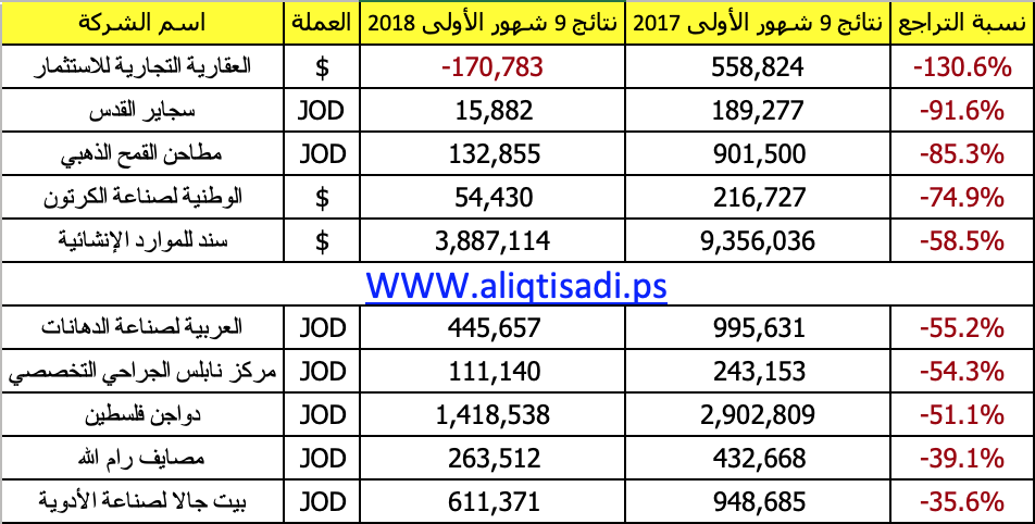 وتجدون في الجدول التالي، باقي أرقام ونتائج الشركات الخمس الأخرى، المدرجة ببورصة فلسطين، الأعلى تراجعا في صافي أرباحها، خلال أول 9 شهور من 2018: