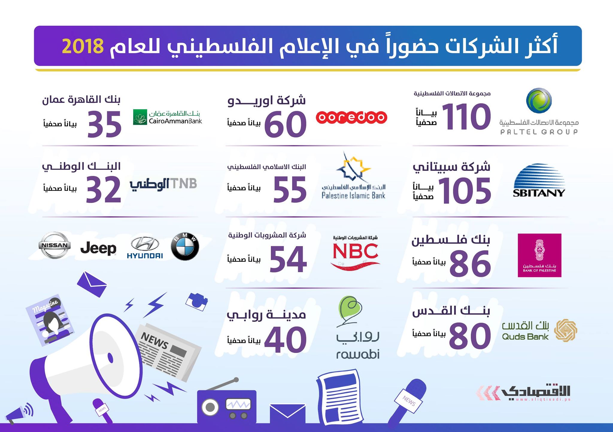 ووفق مسح الاقتصادي، جاءت مجموعة الاتصالات الفلسطينية بالمرتبة الأولى كأكثر الشركات المصدرة للبيانات الصحفية، بعدد بلغ 110 بيانات صحفية، ممثلة بشركات الاتصالات الفلسطينية وجوال وحضارة وشركة ريتش لخدمات الاتصالات.