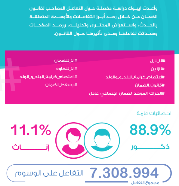 ووفق دراسة اعدها موقع " ايبوك "  الفلسطيني، بلغ مجموع تفاعل الفلسطينين مع الاوسمة " الهشتاغ"  الخاصة بقانون الضمان والتي تم اطلاقها على صفحات مواقع التواصل حوالي ( 7.308.994) تفاعل.