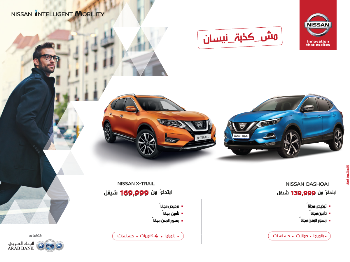 رام الله - خاص الاقتصادي - أطلقت شركة نيسان في فلسطين وبالتعاون مع البنك العربي، حملة عروضات على سيارتي قشقاي Nissan Qashqai ونيسان اكستريل Nissan X Trail بداية شهر نيسان الحالي بعنوان #مش_كذبة_نيسان.
