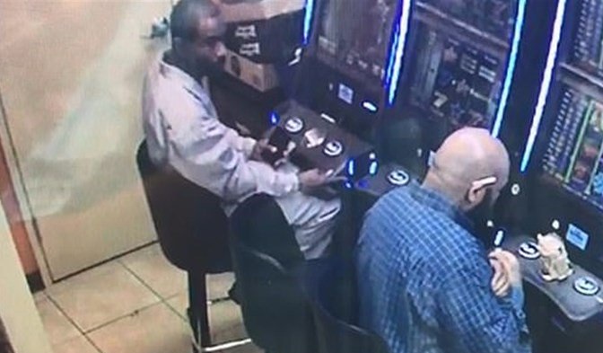 وتظهر اللقطات الرجل المشتبه فيه وهو يلعب بماكينة القمار في حين كان رجل آخر يستخدم ماكينة ثانية بالقرب منه.