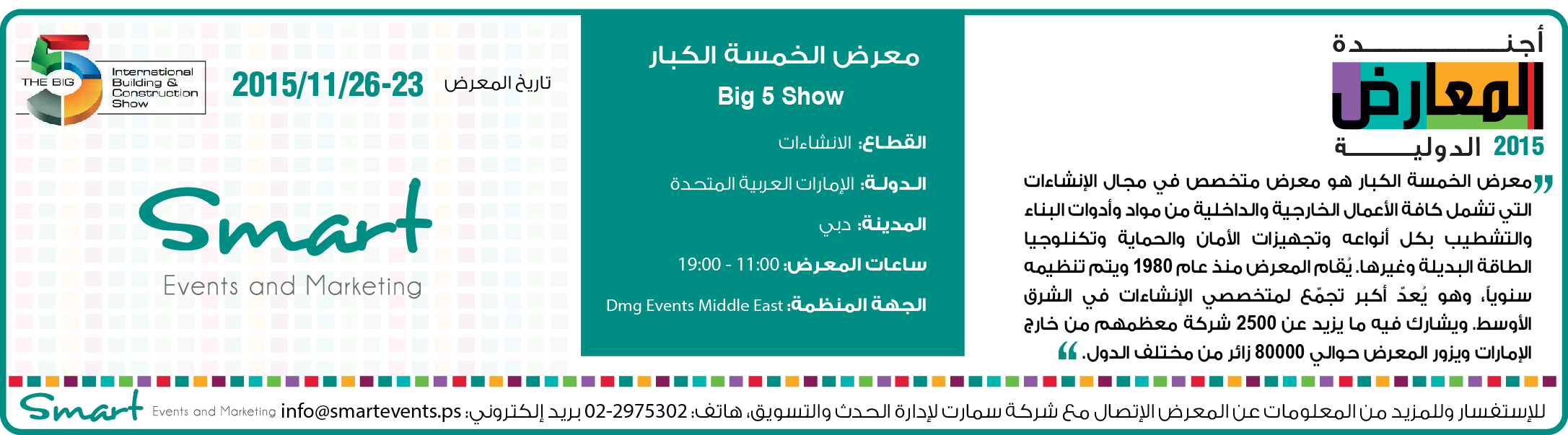 رام الله -الاقتصادي- أعلنت شركة سمارت لإدارة الحدث والتسويق في بيان صحفي صادر عنها عن إصدارها النشرة العاشرة من أجندة المعارض الدولية والتي تصدرها الشركة منذ بداية العام، والتي تعتبر النشرة الدورية الأولى المتخصصة بالمعارض الدولية في فلسطين، حيث تتميز أجندة المعارض الدولية في نشر معلومات عن معارض دولية هامة تهم جميع القطاعات الاقتصادية في السوق الفلسطيني.