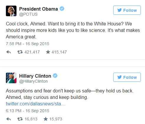 وقد ذاع صيت الطالب الأميركي المسلم من أصول سودانية أحمد محمد بعد أن اعتقلته الشرطة الأميركية لاعتقادهم أن الساعة التي اخترعها كانت قنبلة، وقد تلقى دعوات لزيادة البيت الأبيض بالعاصمة واشنطن ومقر فيس بوك في كاليفورنيا.