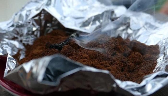 في طبق مُغطّى بورق من الألومنيوم، يُوضَع عليه قليل من بنّ القهوة المطحون أو بقاياه المُجفّفة، مع إشعال النار من منتصفه، ليبدأ في الاحتراق البطيء، ويخرج منه دخان ورائحة تجعل البعوض يهرب بمجرد شمِّها.