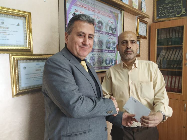 وقام مدير فرع جباليا زكريا صيام بزيارة المدرسة والتقى مديرها السيد أشرف الكرد ونائبه السيد صهيب حمودة وقام بتسليمهم قيمة التبرع.