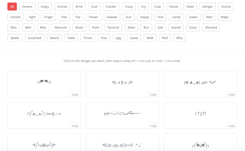 ويمكن للمستخدم الحصول على مجموعة تعابير مزاجية مكوّنة من النصوص عن طريق تصفح موقع Donger List، والذي يشكل قاعدة بيانات للتعابير المختلفة والمصنوعة من رموز نصّية، بحيث يمكن نسخ أي تعبير من هذه التعابير ومشاركته مع الآخرين بسهولة.